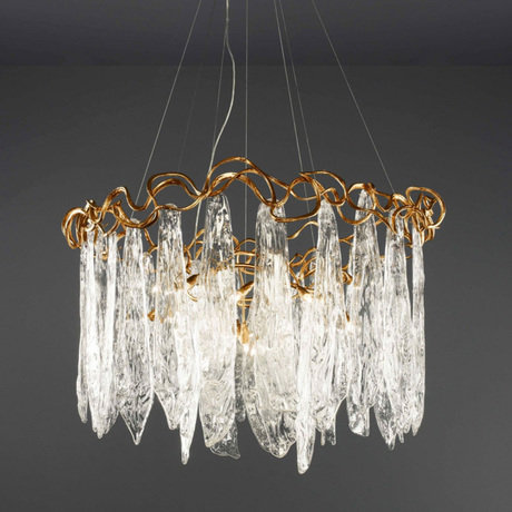 Люстра из коллекции Niagara на арматуре золотого цвета. На арматуре крупные лепестки из прозрачного муранского стекла. Возможны другие варианты по цвету покрытию металла. Идеальные пропорции и изящные линии сочетают в себе классические традиции и новаторство нашего времени. Все изделия Serip изготавливаются вручную, имеют органичные формы и цвета, вливаются в интерьер, делая его утонченнее и ярче.